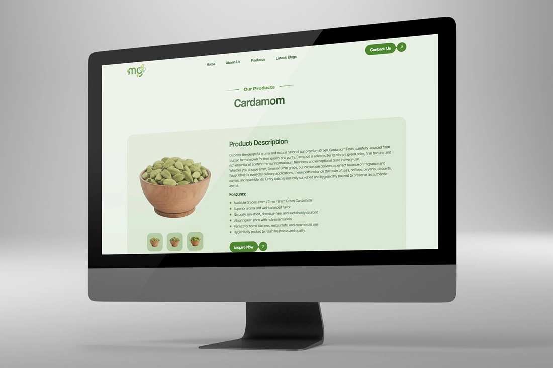 This project involved designing and developing a modern, nature-inspired website for Misty Green Plantation, a Kerala-based spice brand specializing in premium Cardamom and Black Pepper. The website was crafted to reflect the brand’s commitment to purity, sustainability, and highland farming heritage through thoughtful visuals, balanced layouts, and intuitive navigation. Emphasis was placed on user experience, responsive design, and brand storytelling to create a seamless digital presence that communicates quality, authenticity, and trust while effectively showcasing the plantation’s products and values.