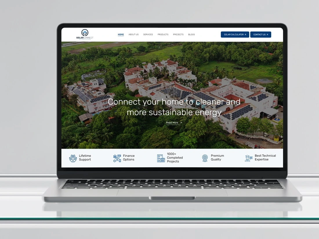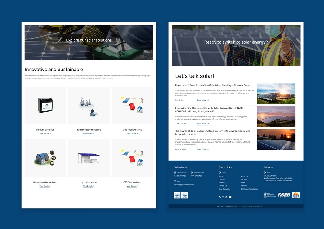 Solar Connect is a solar panel installation firm that has been in this industry for the last 8 years in Trivandrum, Kerala. They have associated with Adani, Sungrow, Rec, Waree, Enphase, Solis inverters, Waacab, Elmex, Growatt, etc. The client wants to develop a website for their business; they approached us, and we understand the client’s business, target audience, and goals for the website. We provide a visually appealing, premium, high-quality, user-friendly website that showcases their services and locations effortlessly and helps them achieve their business objectives.